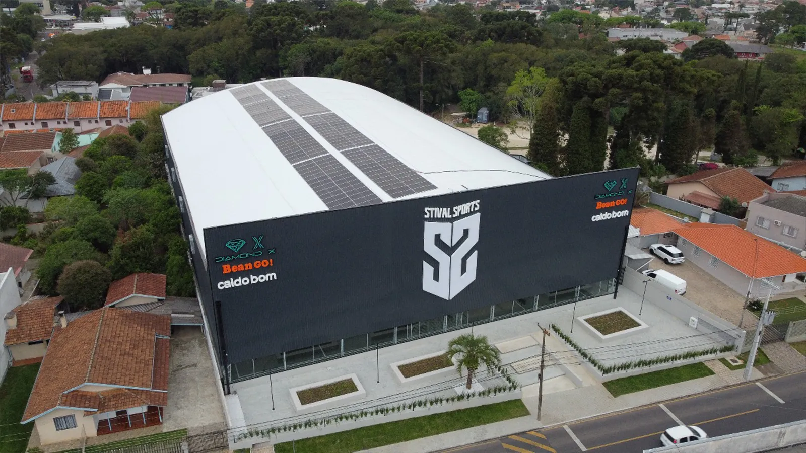 Uma das maiores quadras de futebol em grama sintética do Paraná, onde foram utilizados mais de 5800m² de telhas metálicas com isolamento térmico para melhor controle da temperatura interna.